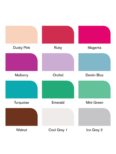 Kolory w zestawie: Dusty Pink, Ruby, Magenta, Mulberry, Orchid, Denim Blue, Turquoise, Emerald, Mint Green, Walnut, Cool Grey 1, Ice Grey 2 + dodatkowo blender