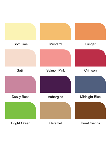 Kolory w zestawie: Soft Lime, Mustard, Ginger, Satin, Salmon Pink, Crimson, Dusky Rose, Aubergine, Midnight Blue, Bright Green, Caramel, Burnt Sienna + dodatkowo blender