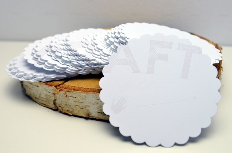 Zestaw białych serwetek ciętych z wykrojnika o średnicy 9,5 cm wyciętych z papieru 300g