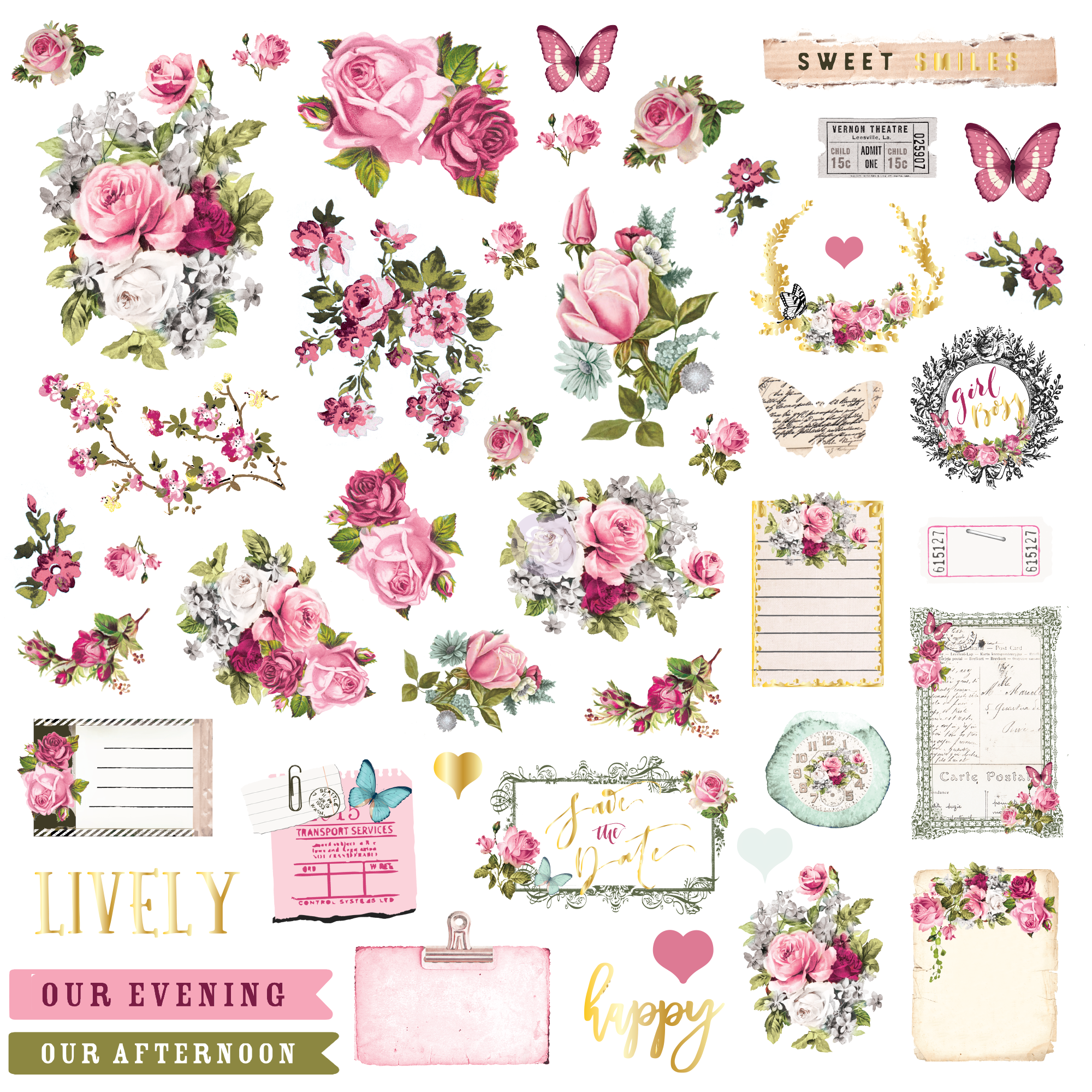 Zestaw zawiera 43 wycięte elementy pasujące do kolekcji Misty Rose oraz 26 naklejek.Część elementów wykończona jest złotą folią.