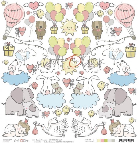 Arkusz wysokiej jakości jednostronnego papieru do scrapbookingu z dodatkami do samodzielnego wycięcia.