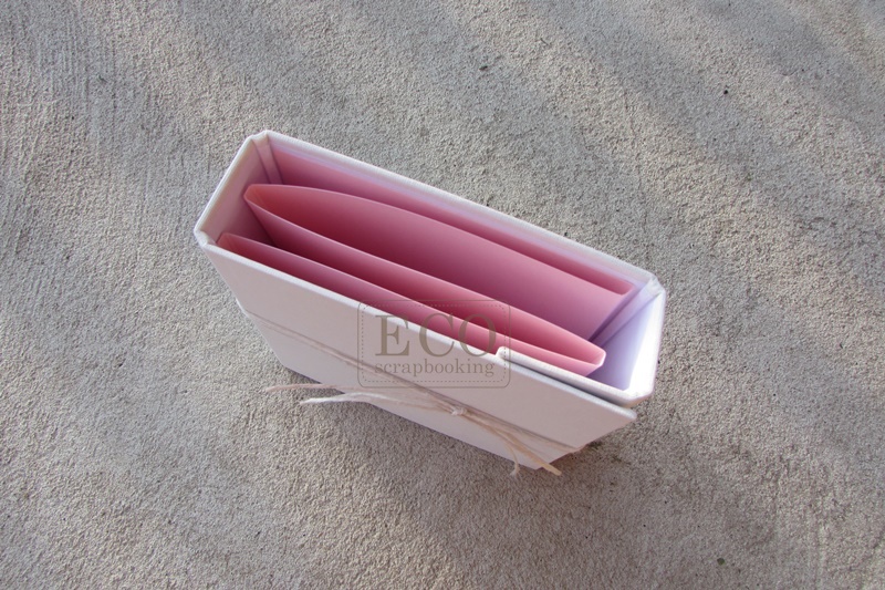 Wykonane z kartonu różowego 230g, album składa się z 5 kart w formacie 130x130mm - wklejone w okładkę z tektury litej oklejonej białym płótnem