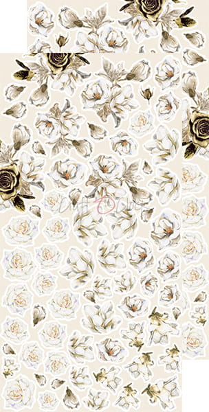 Zestaw 18 arkuszy wysokiej jakości dwustronnego papieru do scrapbookingu z dodatkami do samodzielnego wycięcia - 3x6 wzorów + dodatkowe elementy do wycięcia na odwrocie strony tytułowej. Rozmiar każdego arkusza: 15,5x30,5cm. Gramatura papieru: 250g/m2.
