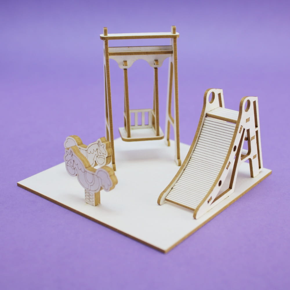 Zestaw składa się z podstawki, zjeżdżalni, huśtawki i dwóch koników.