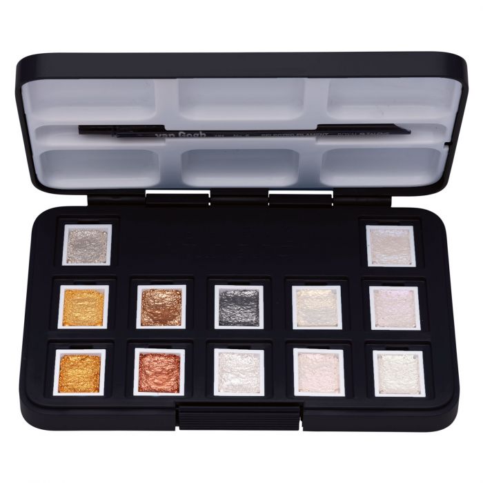 Zestaw do farb wodnych z 12 połówkami miski jest zapakowany w plastikowe pudełko kieszonkowe, a także zawiera okrągłą szczotkę z syntetycznego włosia (rozmiar 6) i tackę do mieszania. Ta specjalność obejmuje kolory metaliczne i interferencyjne: Silver 800, Light Gold 802, Deep Gold 803, Copper 805, Bronze 811, Graphite 840, Interference White 843, Interference Yellow 844, Interference Red 845, Interference Blue 846, Interference Violet 847, Interference Zielony 848.Zapytaj o szczegóły