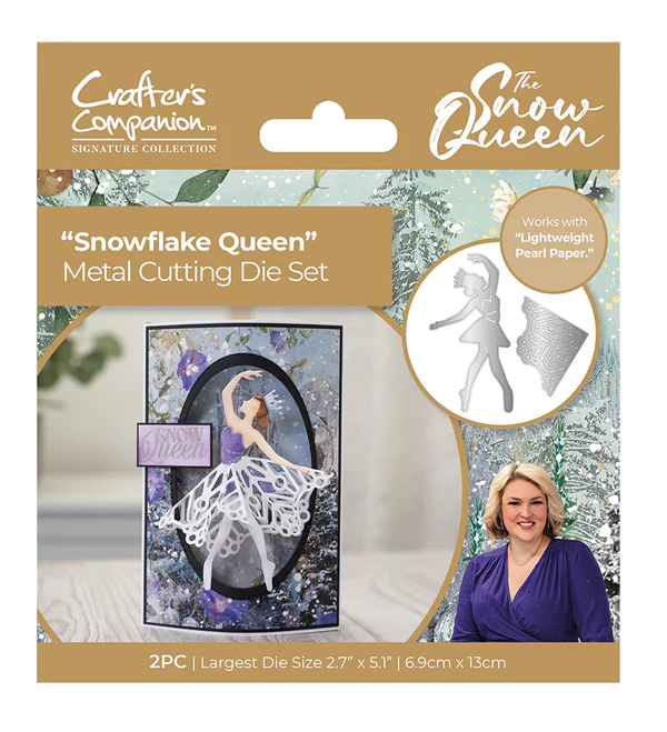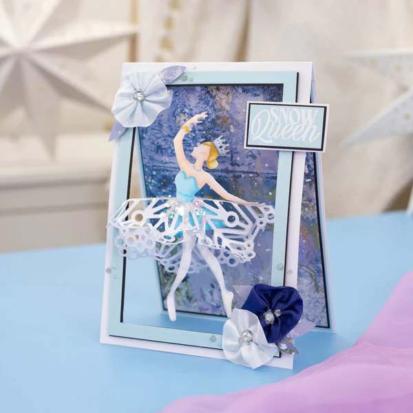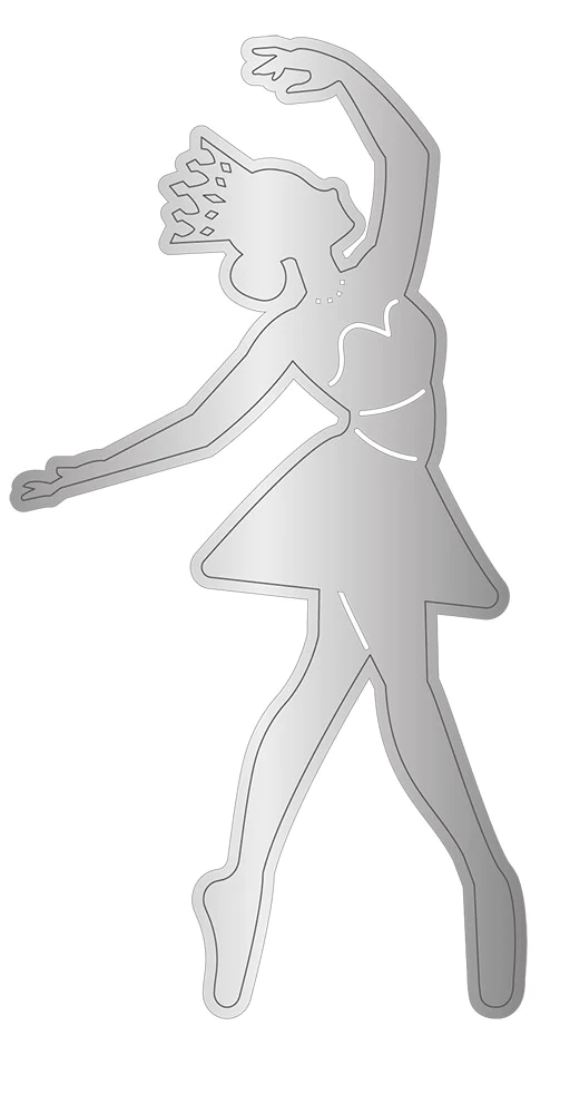 - Dwa metalowe wykrojniki do wycięcia postaci baletnicy z trójwymiarową tutu w kształcie płatka śniegu.