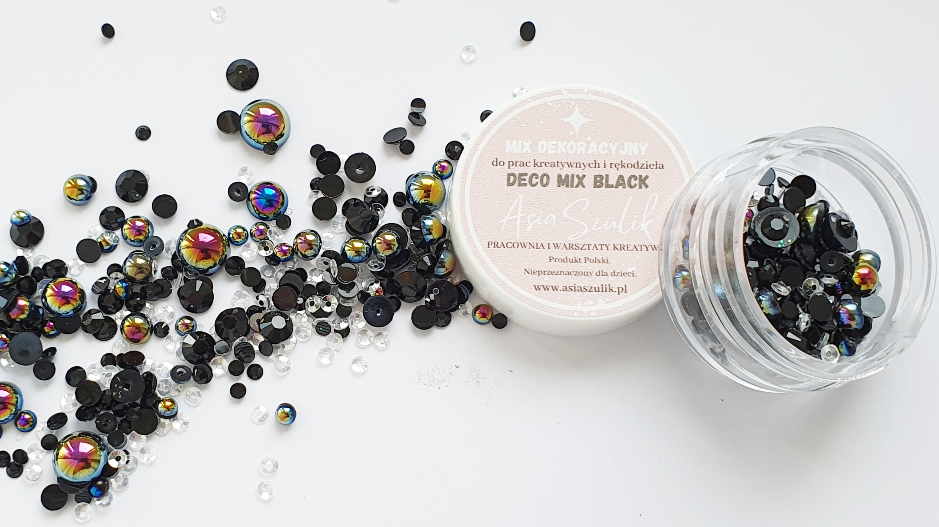 Deko mix white to półperełki, cekiny, kryształki w kolorze czarnym z opalizacją.