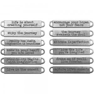 Zestaw 12 metalowych pasków z wyrazistymi hasłami od Tim Holtz, idealnych do projektów typu mixed media, scrapbookingu, ozdabiania albumów czy biżuterii. Każdy pasek zawiera inspirujące słowo lub frazę, taką jak "Journey", "Moment", "Dream", "Hope", "Believe", "Love", "Imagine", "Forever", "Willpower", "Beautiful", "Life" i "Live".