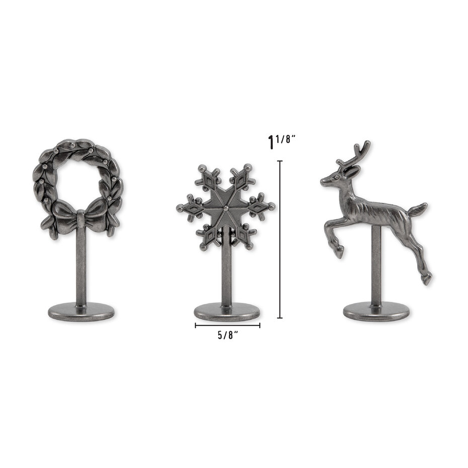 Motywy charms: w zestawie znajdują się zawieszki o tematyce świątecznej – np. wieniec (wreath), płatek śniegu (snowflake) i renifer (reindeer)