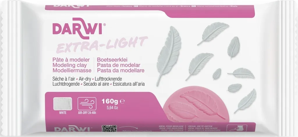 Darwi Extra Light to bardzo lekka masa modelarska, która twardnieje na powietrzu (self-hardening). Po wyschnięciu pozostaje elastyczna, nie pęka i jest znacznie lżejsza niż tradycyjne gliny samoutwardzalne — co pozwala na tworzenie większych lub delikatnych obiektów bez obawy o wagę.