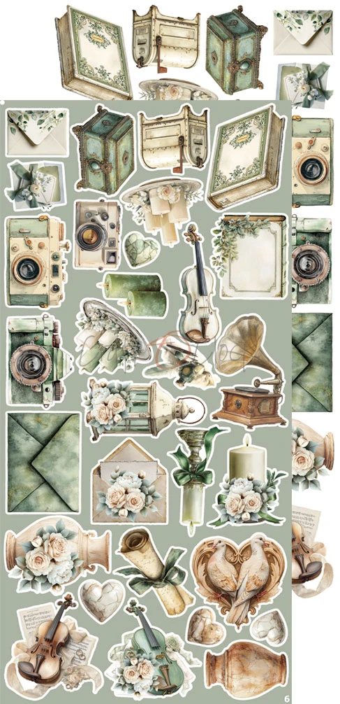 Zestaw 18 arkuszy wysokiej jakości dwustronnego papieru do scrapbookingu z dodatkami do samodzielnego wycięcia - 2x9 wzorów. Rozmiar każdego arkusza: 15,75x30,5cm. Gramatura papieru: 250g/m2.